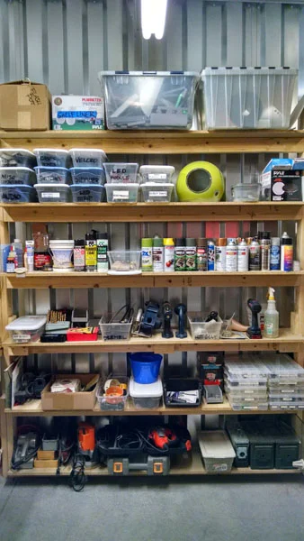 I am a firm believer that one can never have too many shelves and storage boxes. These have really helped me keep all my stuff stowed away neatly yet easy to find. I picked these plastic shoeboxes up at the Dollar Store near my workshop. These are great for storing all kinds of materials.